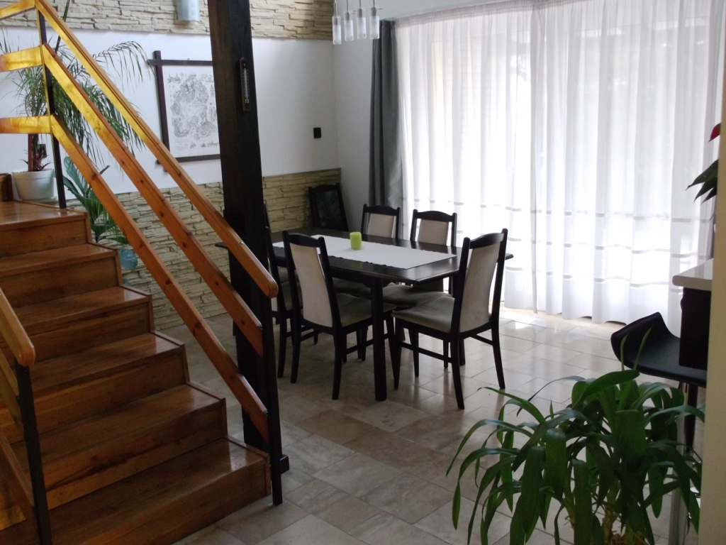 Vendégházunk Révfülöp csendes, nyugodt üdülőövezetében található, a Balaton partjától 500 méterre, gyönyörű kilátással a tóra és a tavat övező hegyekre. A tágas és modern berendezésű házban 8 fő részére tudunk szállást biztosítani. A hatalmas nappali (TV-vel), étkező és a felette elhelyezkedő galéria, valamint a terasz bőséges teret biztosít minden vendég számára. A ház légkondícionált. Internet elérhetőség (WiFi) biztosított. A minden igényt kielégítő konyha kényelmessé teszi a pihenést.(hűtőszekrények, mikrohullámú sütő, mosogatógép stb.) A ház földszinti része lépcső nélkül is megközelíthető. Négy szoba, - ebből 1 háromágyas erkéllyel, 2 kétágyas erkéllyel és 1 egyágyas - két fürdőszobával és két külön álló WC-vel áll a vendégek rendelkezésére. Az egy és a háromágyas szobák ágyainak elhelyezése az igényeknek megfelelően variálható (kétágyassá alakíthatók). Az épületet körülvevő gondozott kertben biztonságos parkolásra, grillezésre, napozásra nyílik lehetőség. Rövid sétával étterem, élelmiszerbolt, strand és a faluközpont is elérhető.